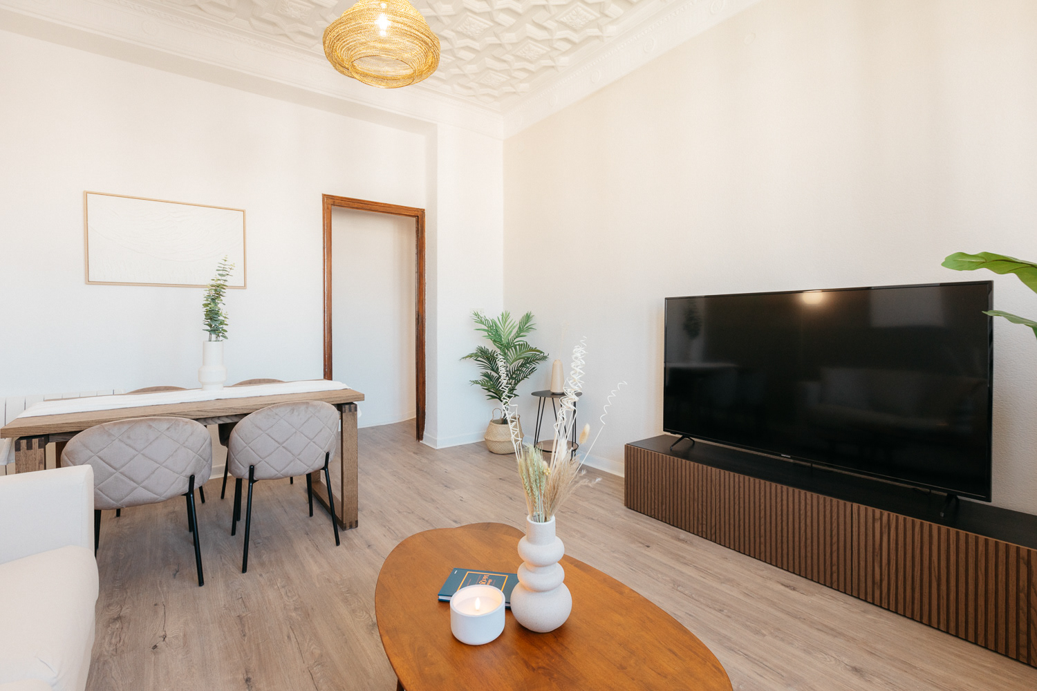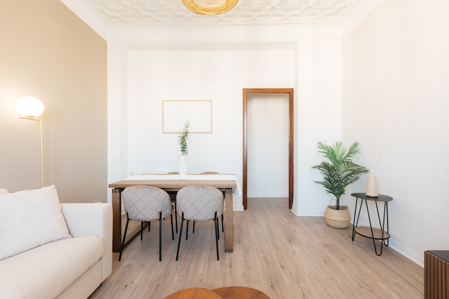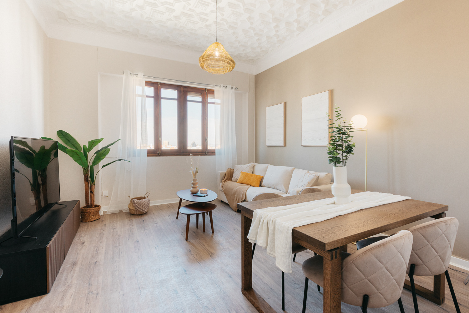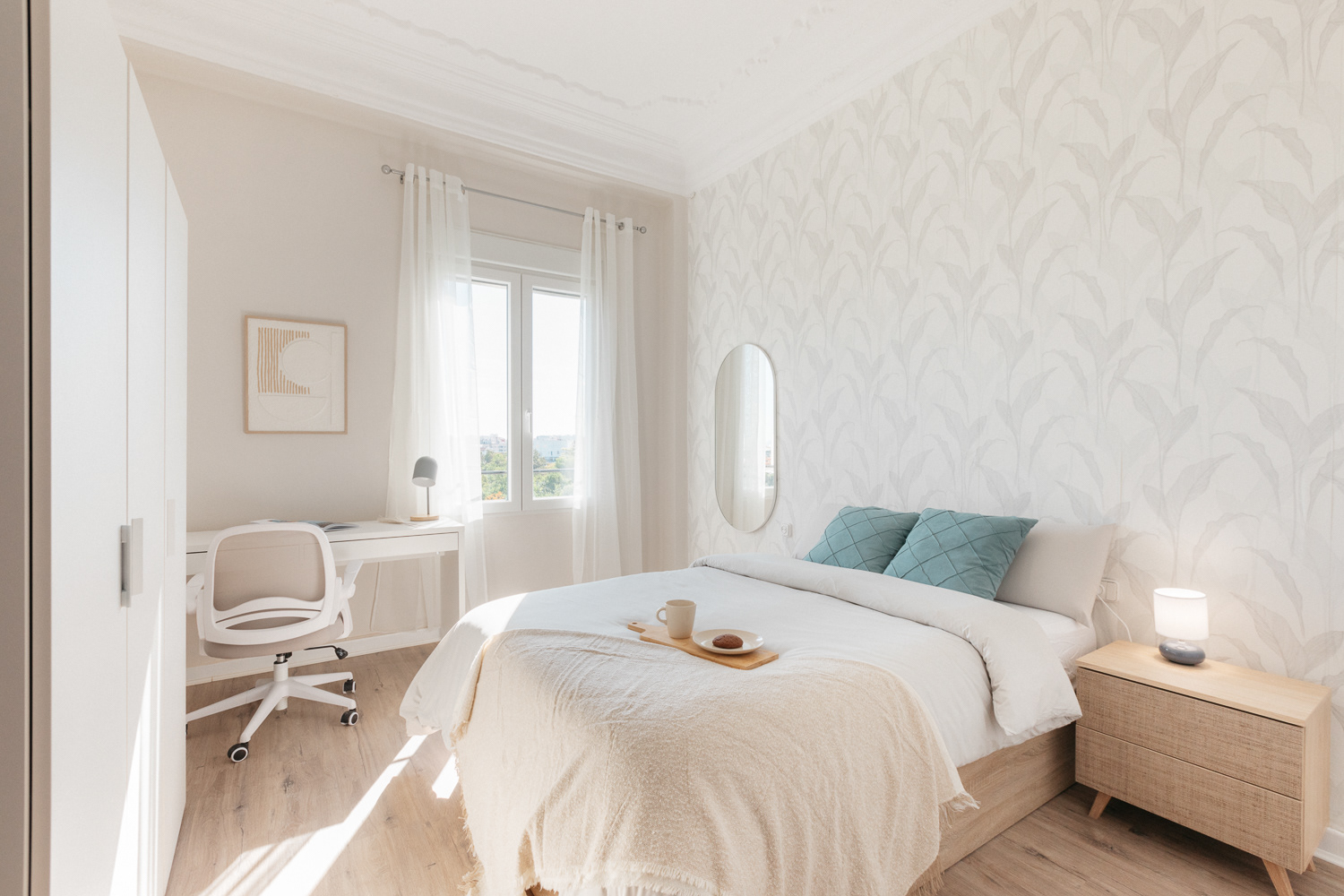 "Un refugio de tranquilidad en medio de la ciudad". Un espacio para 4. La remodelación de un apartamento frente al hermoso Jardín Botánico de Valencia. Donde la vegetación nos inspira y se refleja en cada detalle interior. Empapelados que simulan hojas, madera natural, colores tostados en contraste de blanco, suelo de parque, y el eminente ingreso de iluminación natural se armonizan para dar lugar a ambientes de relajación, compañía, creatividad y bienestar.