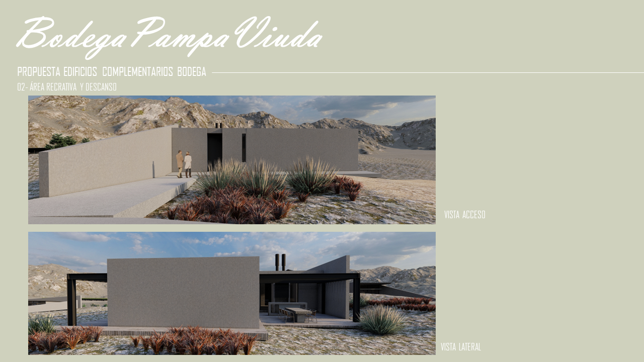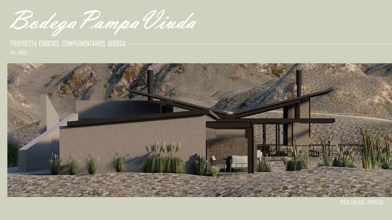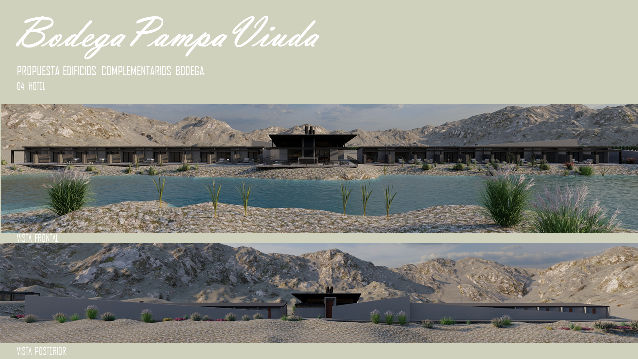 Idea arquitectónica para edificios complementarios de una bodega en construcción ubicada en La Rioja, una fusión armónica con la naturaleza y la funcionalidad. La zona de descanso para empleados ofrece un refugio sereno, rodeado de áreas montañosas que fomentan la conexión con la naturaleza. Su diseño contempla la comodidad y el bienestar, proporcionando un espacio de relajación para el personal. En armonía, el área de hospedaje para turistas se integra con el entorno natural. Cada habitación está diseñada para maximizar las vistas panorámicas, brindando a los visitantes una experiencia única y reconfortante. La protección contra los vientos se logra mediante grandes tabiques de cierre estratégicamente ubicados. Estos elementos arquitectónicos no solo cumplen una función práctica, sino que también añaden un atractivo estético, creando una conexión visual con la robustez del entorno. En resumen, nuestro anteproyecto abraza la dualidad de ofrecer espacios que se sumergen en la naturaleza, al tiempo que garantizan la protección y el confort, creando un ambiente donde la arquitectura y la naturaleza coexisten en perfecta armonía.