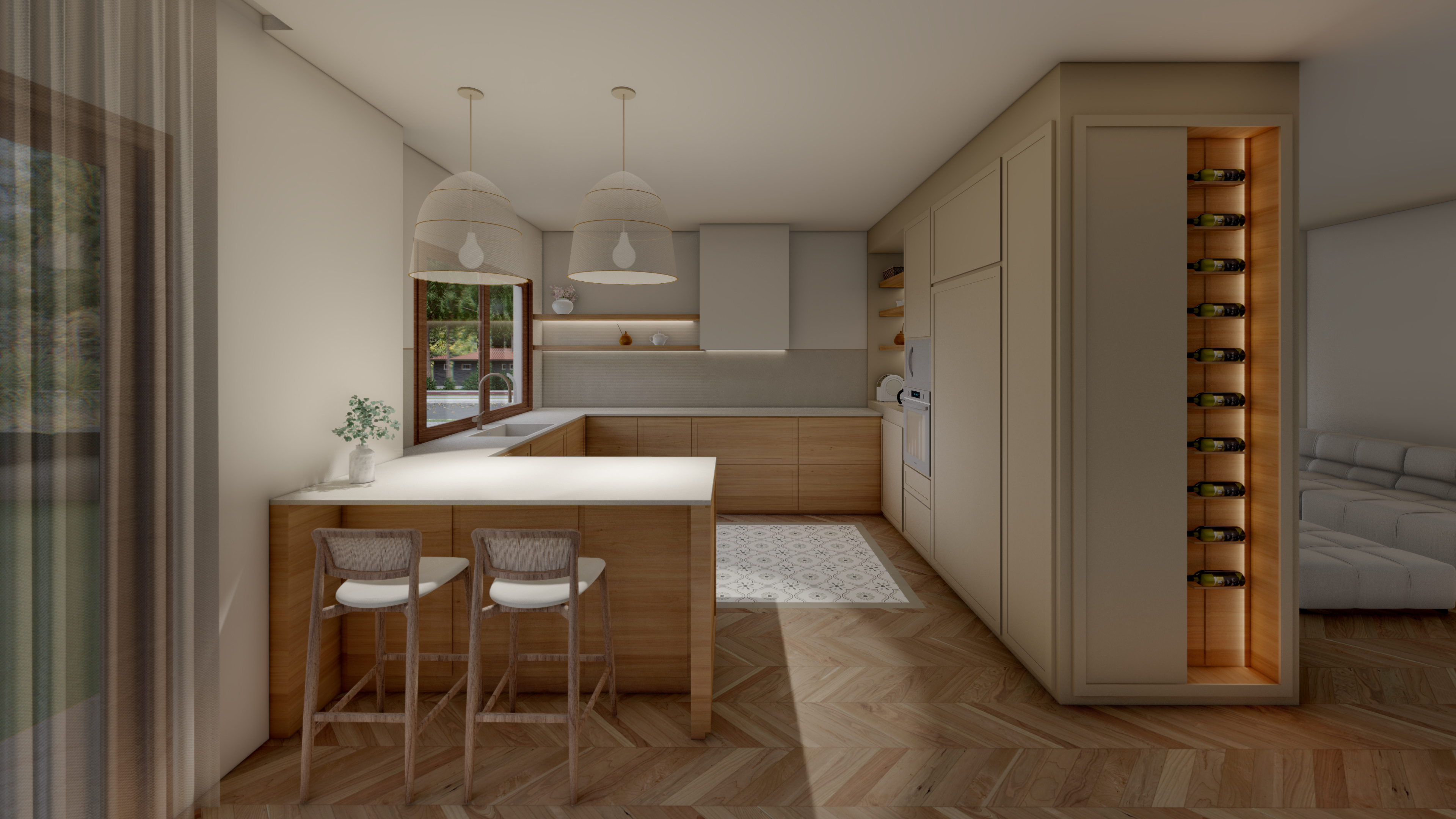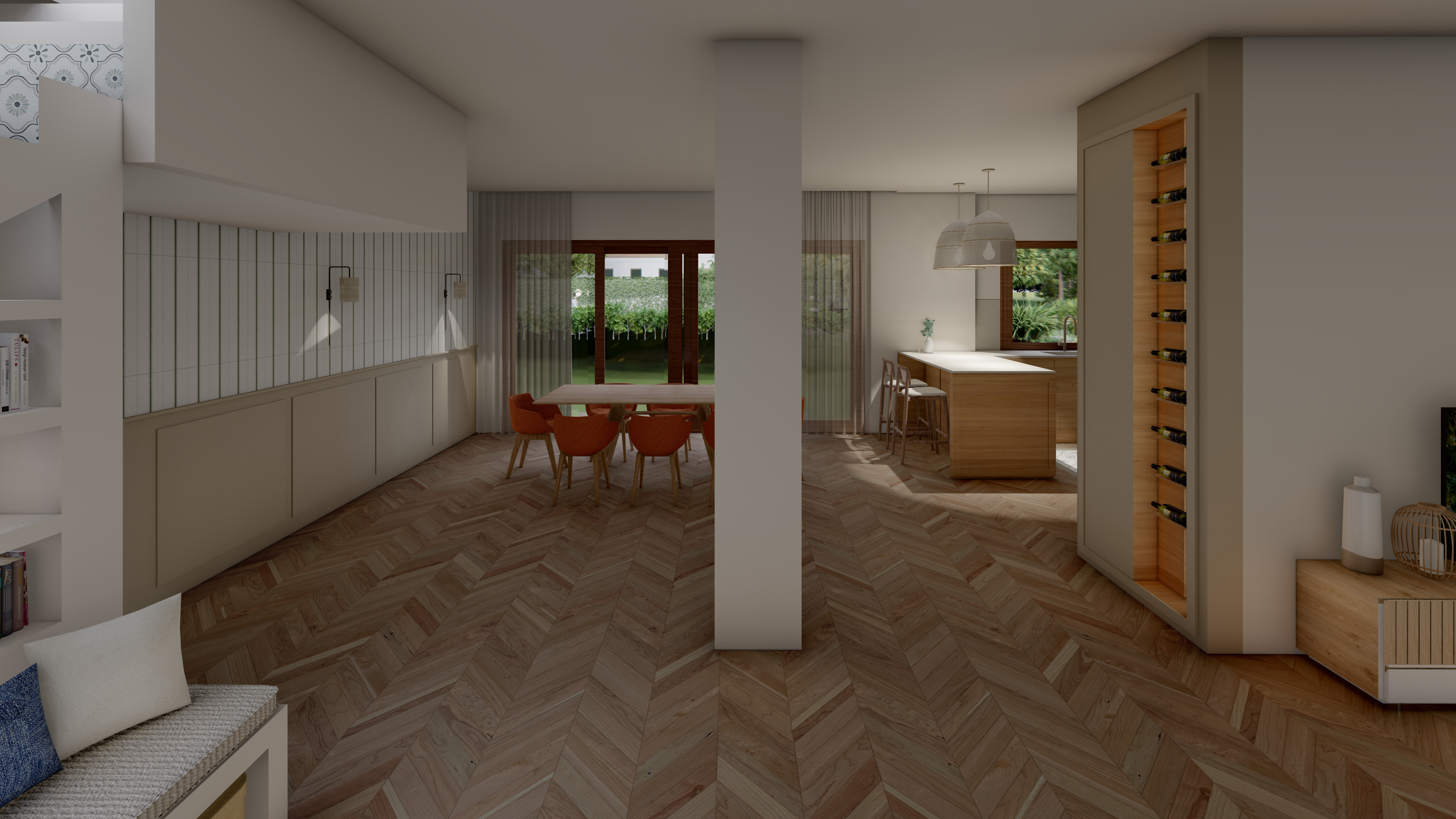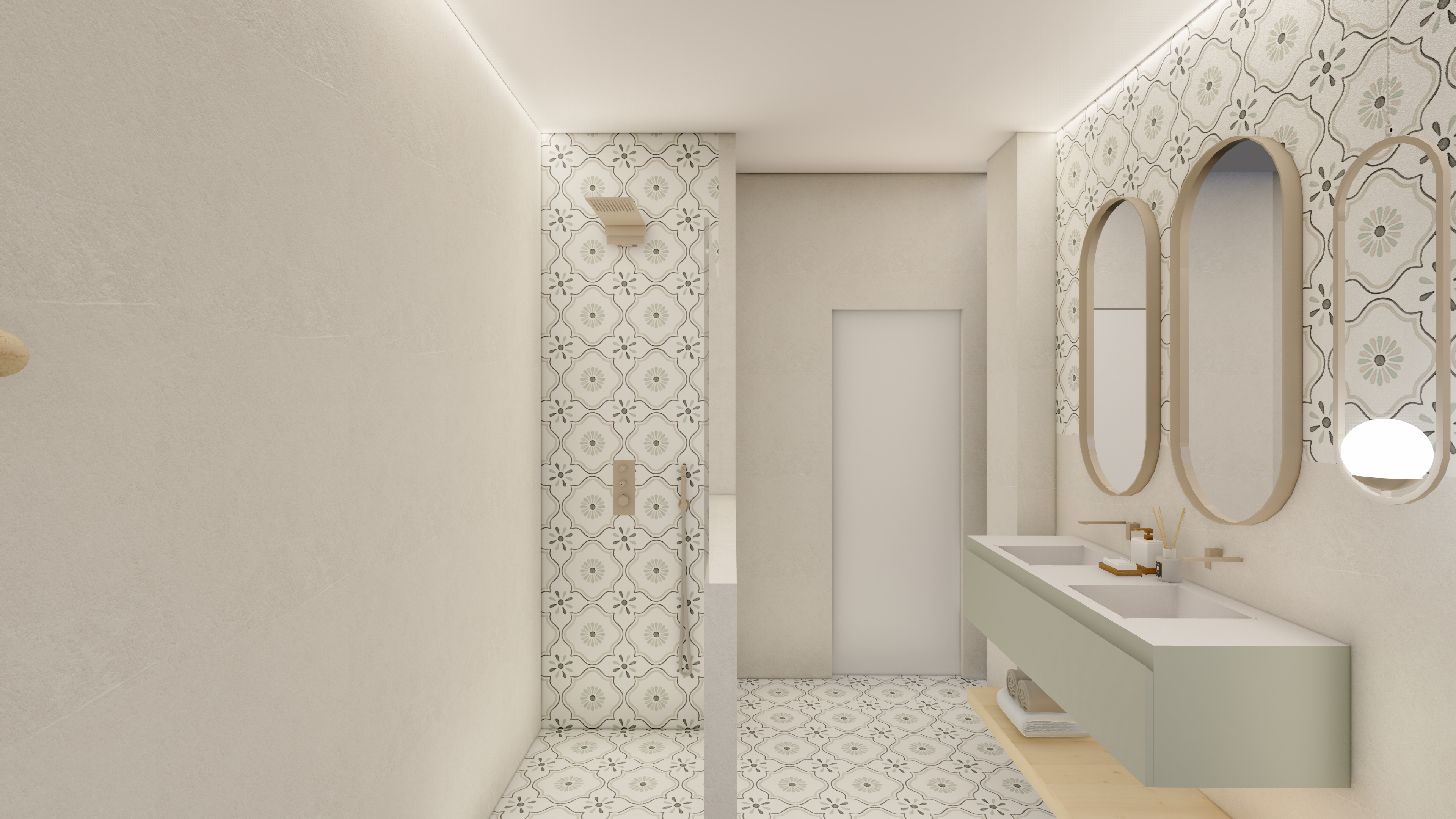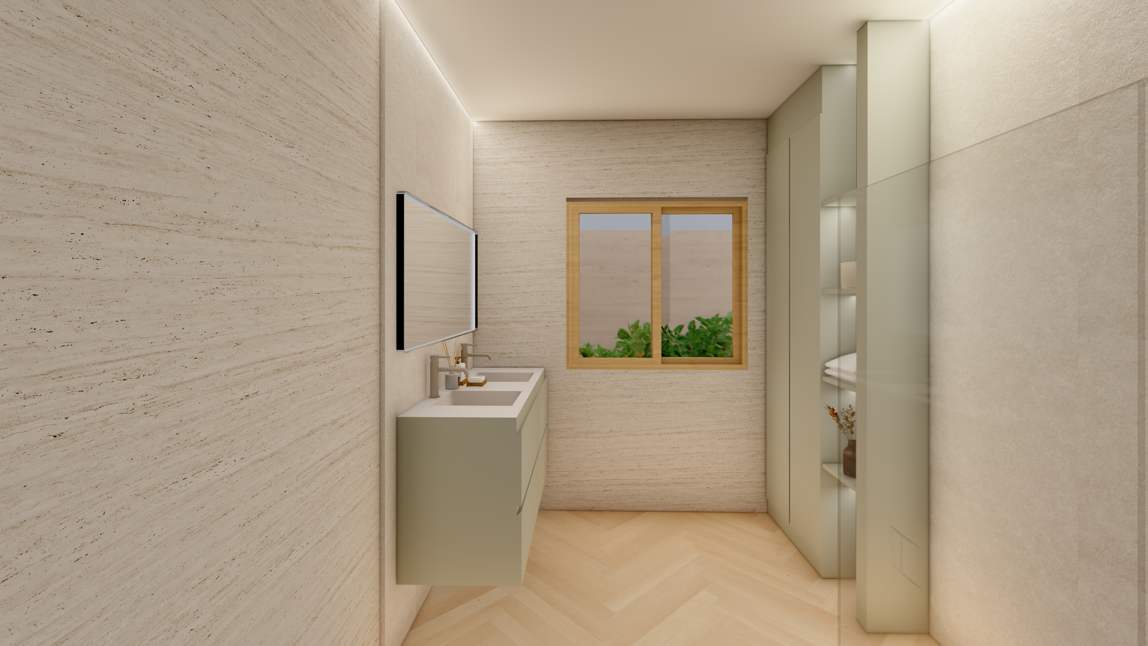 Un proyecto que traduce la esencia mediterránea en armonía material: maderas naturales, blancos luminosos y matices verdes que respiran frescura y equilibrio. A continuación les comparto las visualizaciones que hicimos antes de realizar la reforma integral de la vivienda SH.