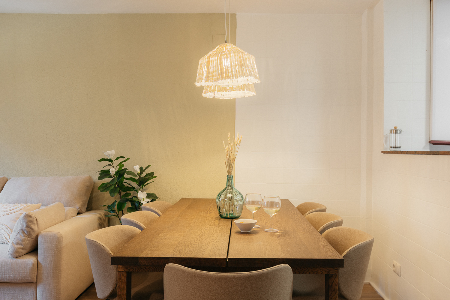 "Los materiales como interlocutores directos del mensaje que buscamos transmitir". El diseño de interior, inspirado en la naturaleza, crea una atmósfera cálida y acogedora, generada a través de materiales naturales como la piedra, hilos de yute y madera. El verde presente en cada ambiente aportando frescura y vitalidad, potenciando la concentración y relajación.